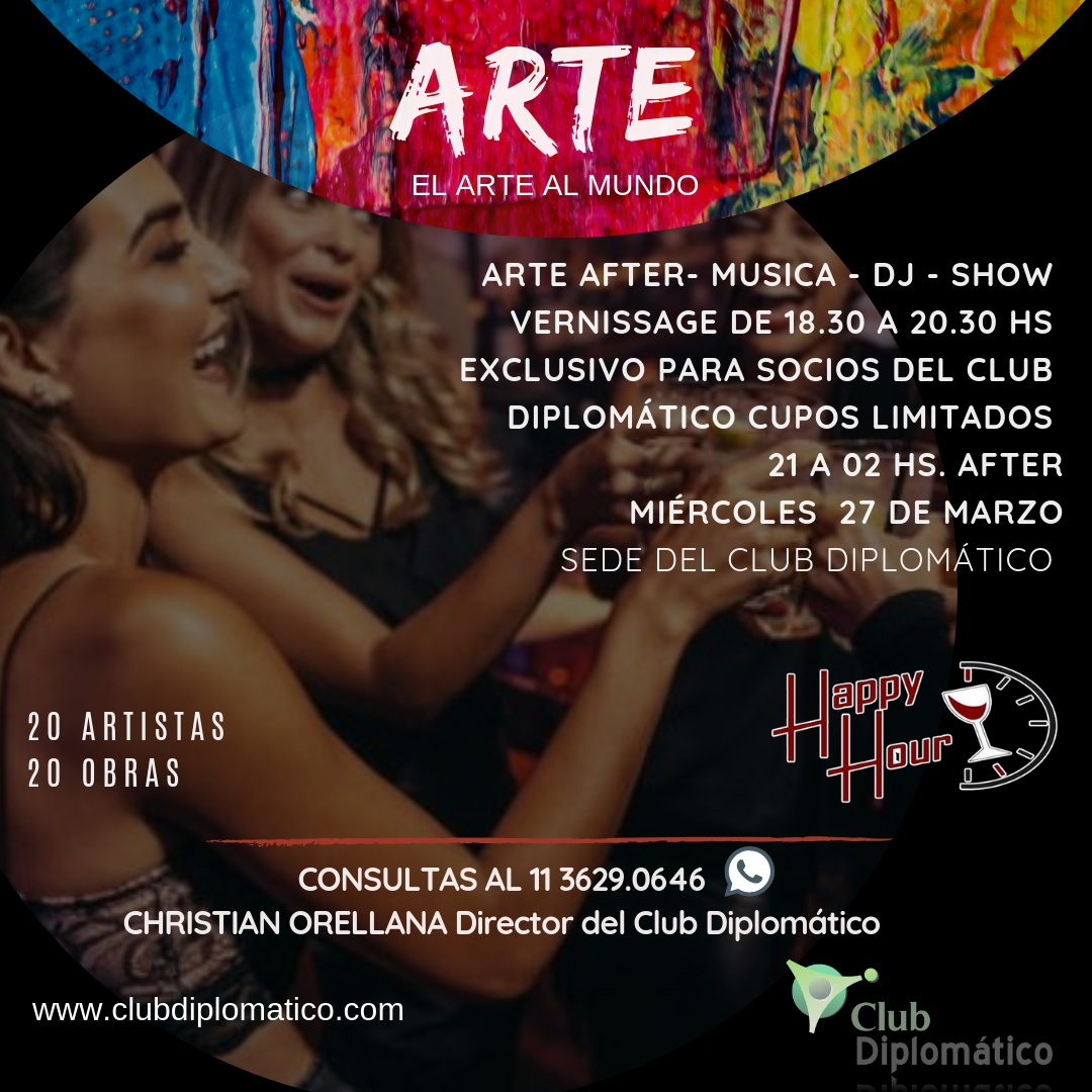 ARTE AL MUNDO – AFTER OFICCE Por Christian12 marzo, 201921 diciembre, 2021Eventos ARTE AFTER- MUSICA – DJ – SHOW VERNISSAGE DE 18.30 A 20.30 HS EXCLUSIVO PARA SOCIOS DEL CLUB DIPLOMÁTICO CUPOS LIMITADOS 21 A 02 HS. AFTER MIÉRCOLES 27 DE MARZO CASONA DEL CLUB DIPLOMÁTICO
